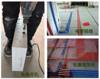 在强、弱电布管时,确保线管横平竖直,强弱电之间间距15cm以上且交接处用锡纸进行包裹,避免强电对弱电信号造成信号的干扰。
