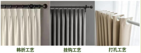①韩式褶皱美观性高;②布艺挂帘易拆卸;③四爪挂钩耐用但是麻烦;④穿孔式消音美观但不好拆卸。