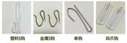 1.塑料S钩:用于韩折加工的窗帘,方便调节高度。