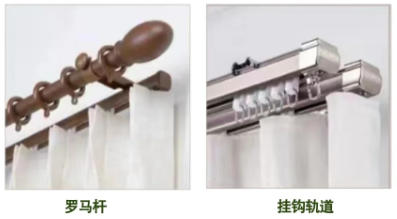 ■盖罗马杆:一根直杆上串挂起窗帘,适合在单一平面上的直型窗户,不适用于L型或U型窗户
