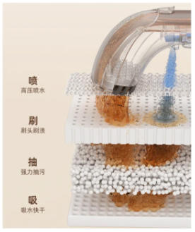 吸力作用把溶解出来的污渍和污水一同吸出,经过喷水漂洗后再快速吸干水分。