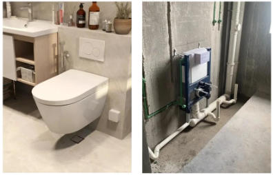 6.解决坑位问题,原毛坯房马桶坑距太靠边,移位太长会堵塞管道,利用壁挂马桶直接改到主管,不堵塞。