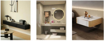 悬浮式柜体下方留空可以有更方便的使用功能,比如收纳柜下方放置扫地机器人;玄关柜下方收纳常穿的鞋子:浴室柜下方留空避免水汽入侵等,功能性与实用性兼备。